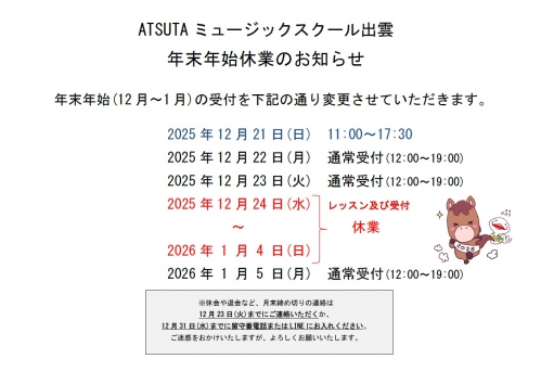 年末年始(12月~1月)は、受付を下記の通り変更させていただきます。